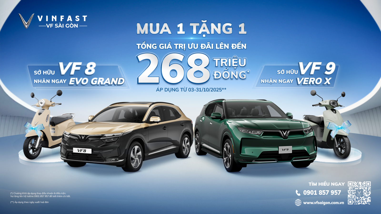 VinFast VF Sài Gòn mang đến chương trình ưu đãi siêu hấp dẫn cuối năm 2025, dành riêng cho hai mẫu xe điện cao cấp VF 8 và VF 9 – biểu tượng của công nghệ xanh, phong cách hiện đại và chuẩn sống thông minh.