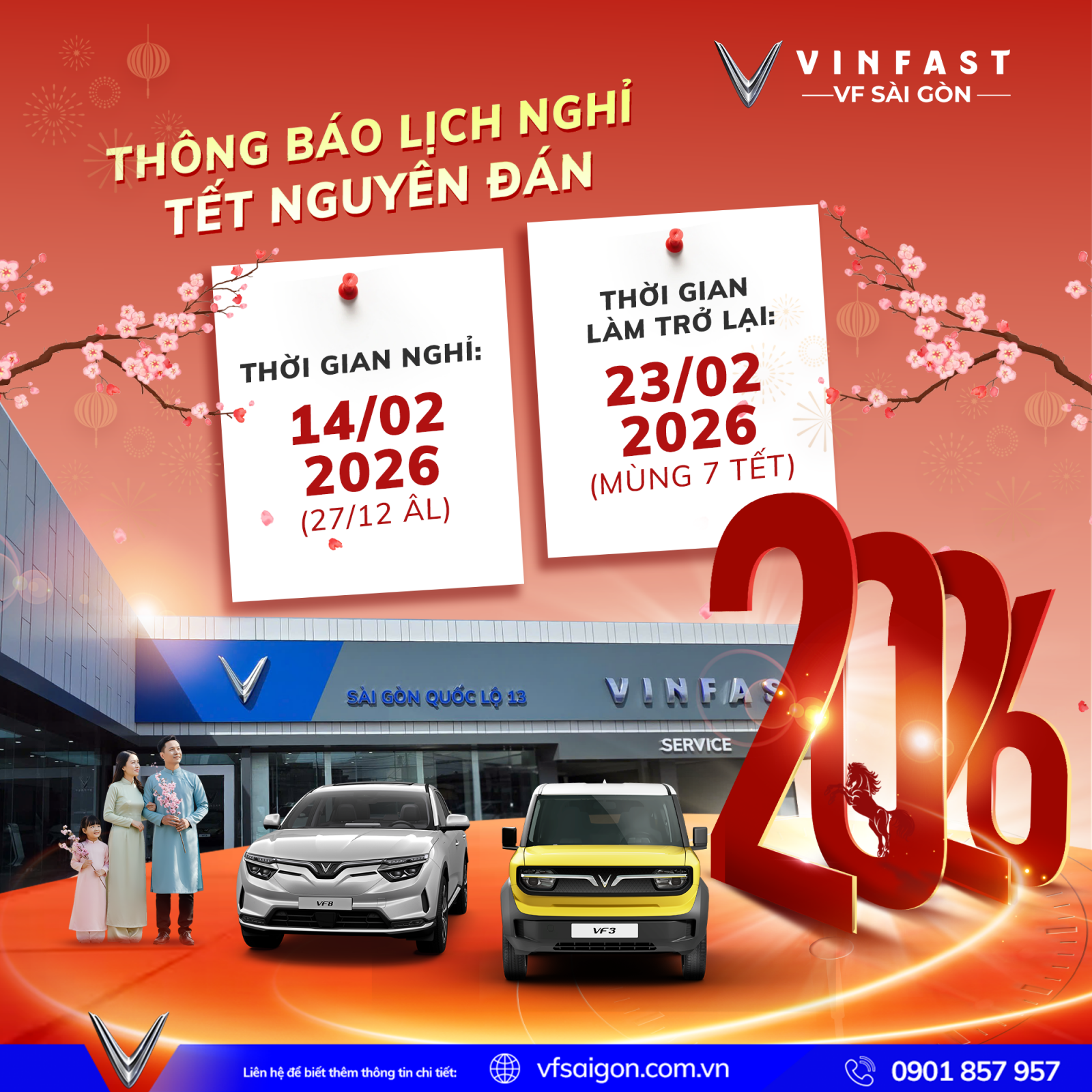 Trong không khí rộn ràng chào đón Xuân Bính Ngọ 2026, VinFast VF Sài Gòn xin trân trọng thông báo đến Quý Khách hàng và Quý Đối tác lịch nghỉ Tết Nguyên Đán năm 2026 nhằm giúp Quý khách thuận tiện trong việc sắp xếp thời gian mua xe, bảo dưỡng và sử dụng dịch vụ.